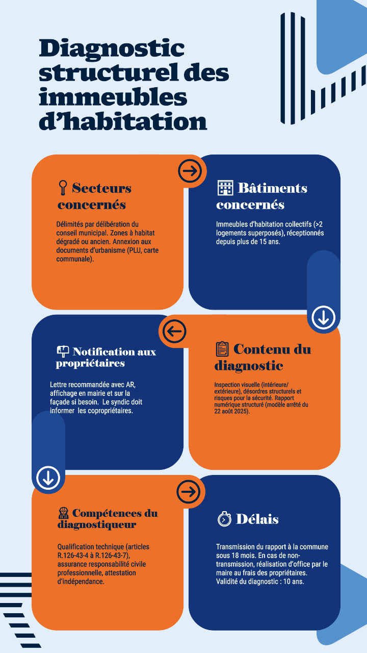 L’arrêté du 22 août 2025 définit le modèle de rapport de diagnostic structurel qui devra être utilisé par les professionnels qui interviennent sur des bâtiments d’habitation collectifs situés dans les secteurs géographiques prioritaires définis par délibération du conseil municipal. Ce modèle standardisé de rapport a été mis en place pour harmoniser les pratiques. Il détaille la trame du rapport (par ex. parties obligatoires, rubriques à couvrir) et assure que tous les diagnostics comportent les mêmes rubriques essentielles.