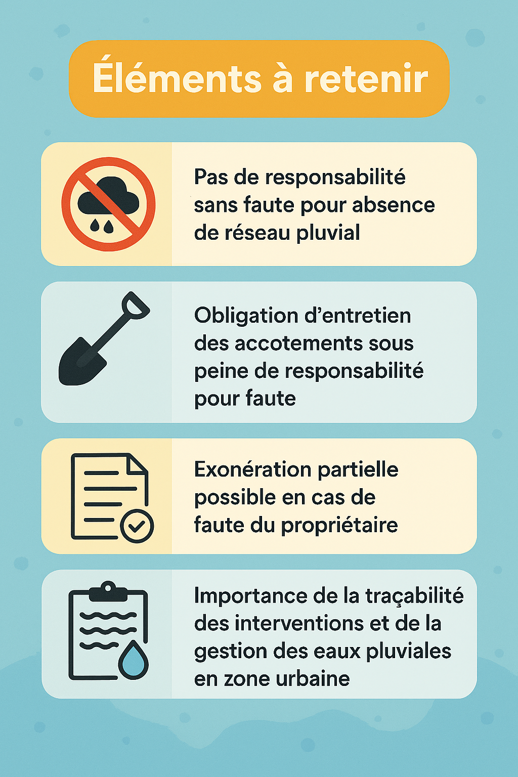 ✔ Aucune disposition du Code général des collectivités territoriales (articles L. 2212-2, L. 2226-1, R. 2226-1) n’impose aux communes ou EPCI de créer des réseaux capables de recueillir l’ensemble des eaux pluviales ruisselant sur leur territoire (CE, 11 février 2022 : n° 449831).